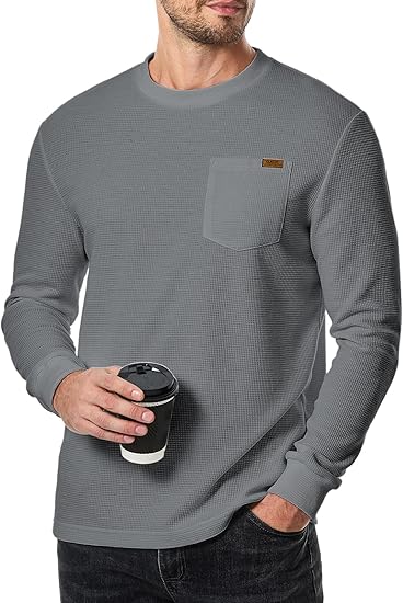 Men's Long Sleeve Shirt Casual Crewneck Lightweight Sweater Honeycomb Waffle Solid Knitted T Shirts with Pocket