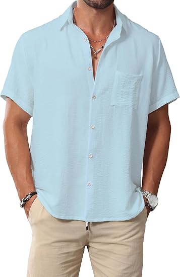 Mens Linen Shirt Short Sleeve Casual Cotton Button Down Shirts Collared Summer Beach Shirts